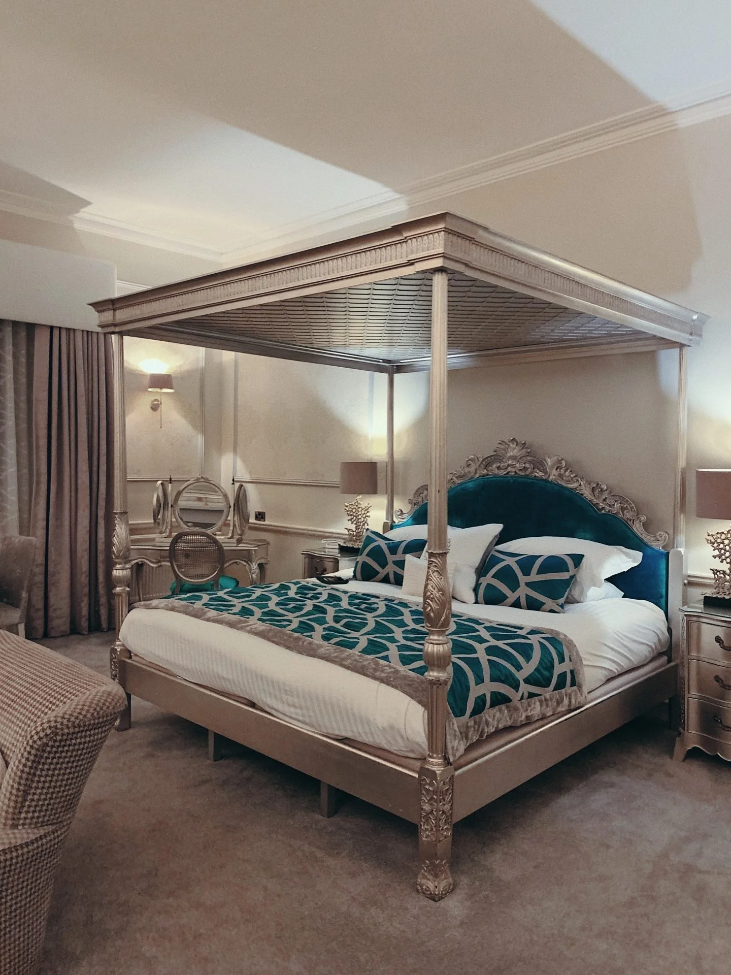 We were half in love with the place already. Then we checked into our room! The incredibly decadent Tiffany Suite (based on the Audrey Hepburn classic Breakfast at Tiffany’s) featuring a stunning four poster bed worthy of Hollywood royalty. And the bathroom. Reader, I will dream about the freestanding slipper bath for years to come.